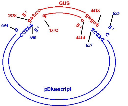 EXAMPLE:  Cloning beta-glucuronidase gene (GUS) from pBI101 to pBluescriptKSm13+.