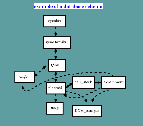 A database can be simply a repository of data. However, by encoding the relationships between different types of information, it becomes a knowledge base. In the figure above, information about different types of objects, such as species, plasmids, or DNA samples, is stored in discrete entries, known in ACEDB as 'classes'. Links between classes, called 'tags', show how they are related. For example, a species may have many gene families, and a gene gamily may be represented by many copies of a gene. An experiment may point to many types of objects.