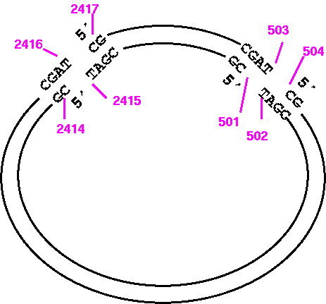 To view the top strand of the PvuI (CGAT^CG) fragment going clockwise from 2417 to 503:
