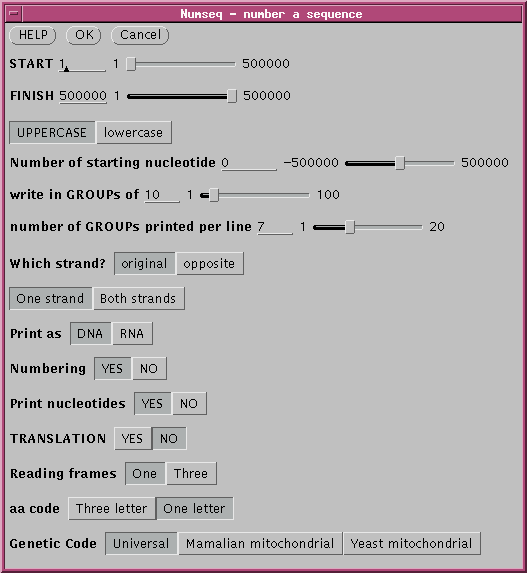 6) GPL: 4NUMSEQ breaks up the sequence into groups of nucleotides, numbering each group. For translation, GROUP must be divisible by 3, because translation is done in discrete codons of 3 bases each. GPL is set to 4 so that the output line will fit on a typical 80-character line.