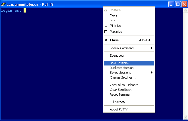 Launch Putty from the Windows Start menu eg. Start --> INS Programs --> Internet --> Telnet --> Putty. A Putty window will pop up. Get the Putty menu by right-clicking on the header bar.