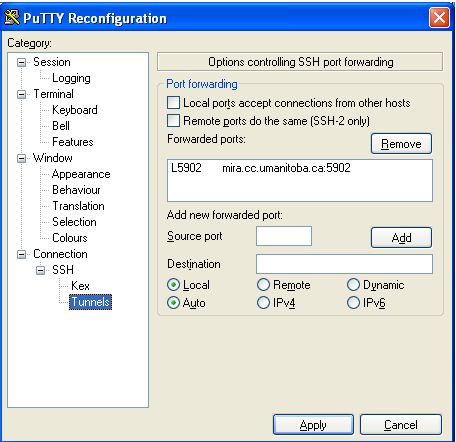 Enter '5902' in the Source Port box. This tells which port to use on the PC. (If that port was in use, any other port would be okay.) Next, in the Destination box, type in 'mira.cc.umanitoba.ca:5902'. Click on the Add button to add this connection to the mira profile.  Click on Apply. Your Putty connection will now allow port secure port forwarding, which will be used by VNC.
