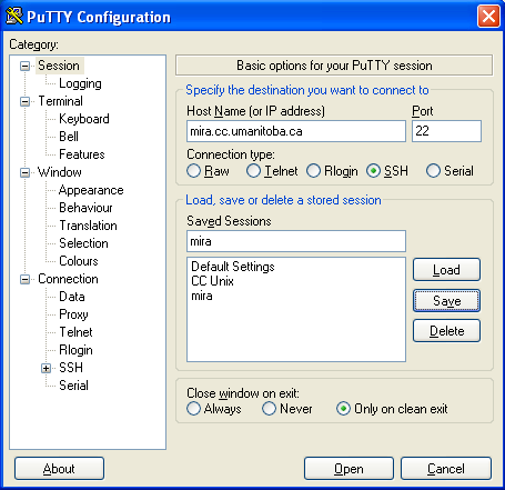 Choose New Session. In this example, the Host Name is set to 'mira.cc.umanitoba.ca'. We are using the SSH encryption protocol, which is the standard for highly-secure communications across the Internet. You can save these settings by typing 'mira' in the Saved Sessions box and clicking on Save.