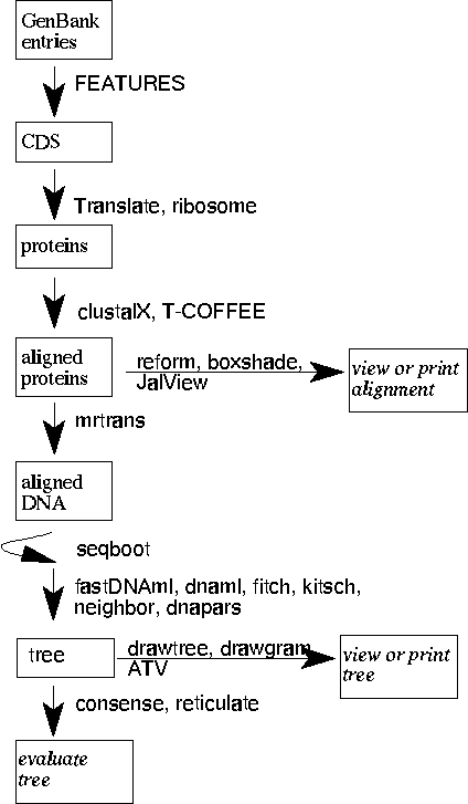 | BIRCH makes it easy to take data from one program to the next, allowing the user to tailor the flow of analysis for a given problem. This figure illustrates the steps in construction of a phylogenetic tree, from raw GenBank entries to trees replicated by bootstrapping. At each step in the process, the user can choose one of several programs. biolegato takes care of moving data from one program to the next. | |