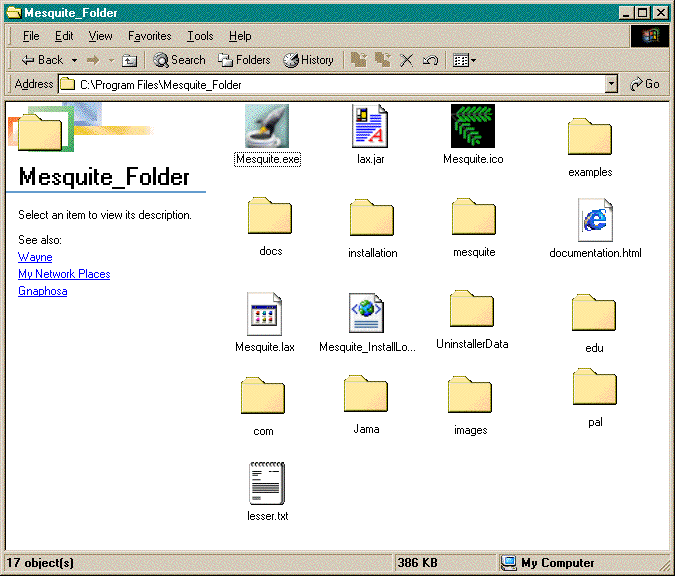 This should create the directory "Mesquite_Folder", and within it, the directory "mesquite" and several files, approximately as follows (the icons and details may differ).