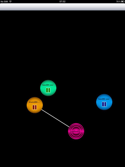 What is BubbleTracks?It is a graphical tactile music interface to be used for performance and leisure for iOS. BubbleTracks uses circles called "bubbles" that can be triggered, untriggered or resized to control the rendering of audio. These bubbles can be linked to one another and this link will have an impact on control or rendering of the audio. For instance, a link between an audio source and a digital audio effect will correspond to a route from that audio source to that effect. The position of the bubbles may also affect the audio rendering : parameters of the audio effect are modified by moving the bubble on the iOS device. There are several types of bubbles :
