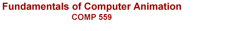 Overview and ObjectivesThis course will provide an introduction to computational techniques for generating animation. Topics will include methods which have applications in the creation of movie effects, the development of video games, and training simulations. While the focus will largely be on physically based methods for the automatic generation of motion, part of the course may cover methods for user control of animation and reuse of captured motion data. See the schedule below for a list of topics. The main objective of this course is to have students develop an understanding of fundamental techniques used for computer animation. At the end of the term, students will have knowledge of different formulations for different physical systems (rigid bodies, elastic solids, fluids), handling collision and contact, techniques for stable time stepping of these systems and necessary solvers (sparse linear systems, constrained optimization). Students will also be able to identify the advantages and disadvantages of different simulations with respect to both online and offline applications. Students will also be able to implement animation techniques, using common software languages and tools. Finally, in addition to an understanding of current practices in computer animation, a general objective is for students to better recognize current important challenges in computer animation. PrerequisitesStudents taking this course should have good knowledge of linear algebra (linear systems, eigenvalues), calculus (basic differential equations, vector calculus, partial derivatives), and be comfortable programming in Python for assignments. Some review will be done in class when necessary or appropriate. While a computer graphics background is an asset for studing computer animation, it is not critial given the material covered. Undergraduates who have taken the COMP 557 prerequisites (MATH 222, MATH 223, COMP 250, COMP 206) should have the necessary background to succeed. COMP 350 is now officially no longer a prerequisite, though please note that numerical computing is a big part of computer animation. While computer graphics (COMP 557) is useful algorithms and datastructures related to 3D geometry, viewing and drawing, which is likewise useful for the course, it is not critical to learn the fundamentals of comptuer animation (some of the examples and the assignments will focus on simpler 2D systems which can be extended to 3D). Topics of transformations and interpolation will be covered as necessary in this course. See also the prerequisites section of this web page for more information. Course format and evaluationThe class will be taught through a series of lectures. Grading will be largely based on assignments, a midterm, and a final exam. The intent is for students to get hands on experience with the material in the course. There are three components to the grading scheme.